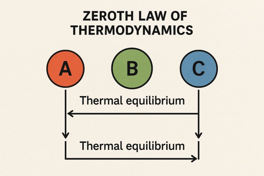 When a body, ‘A’, is in thermal equilibrium with another body, ‘b’, and also separately in thermal equilibrium with a body ‘, C’, then body, ‘B’ and ‘C’, will also be in thermal equilibrium with each other. This statement defines the zeroth law of thermodynamics. The law is based on temperature measurement.
